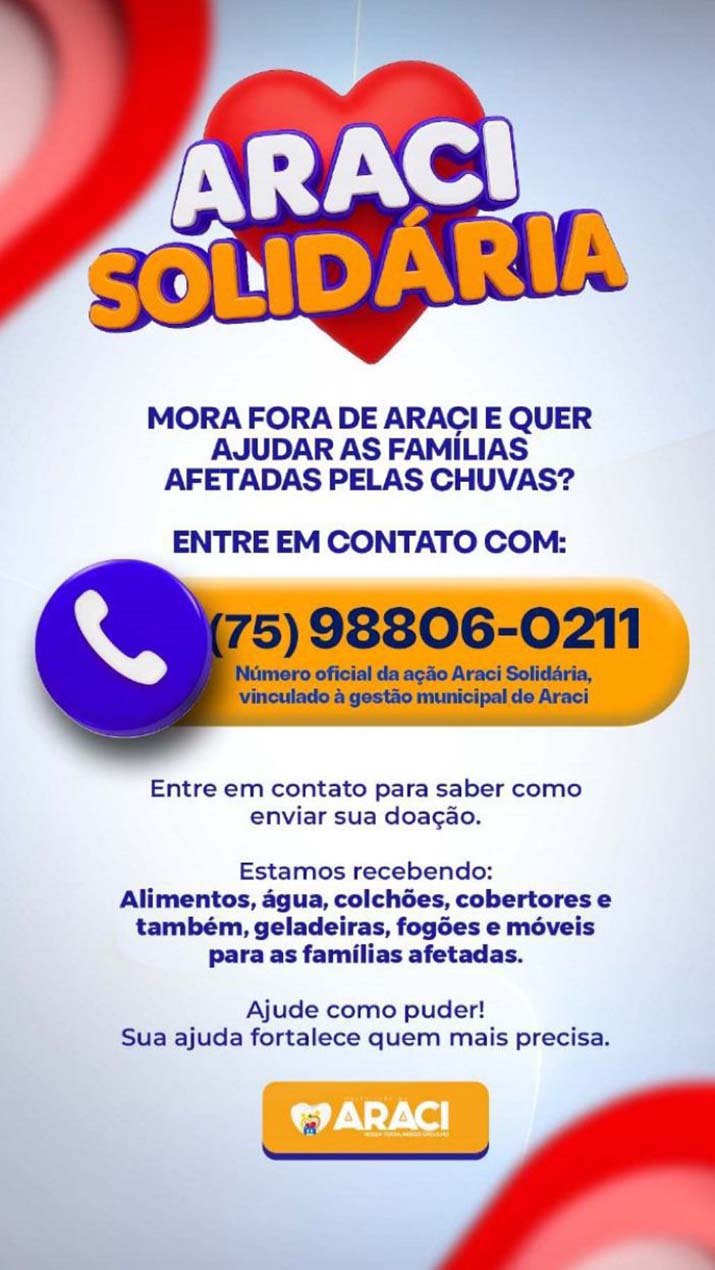 A Prefeitura de Araci lançou uma campanha solidária para mobilizar apoio às famílias que foram afetadas pelas fortes chuvas que atingiram o município nesta semana. A ação busca arrecadar alimentos, água, colchões, cobertores, móveis e eletrodomésticos para ajudar quem perdeu bens ou precisou deixar suas casas após o temporal.